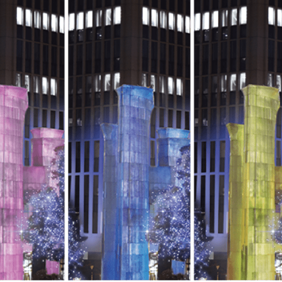 In each of the seven zones, colors representing the history of the city’s development are layered with hues that reflect the modern cityscape, creating a vibrant illumination that colors the night skies of Osaka.