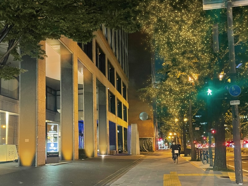 올해는 나무 뿌리 부분에도 조명을 설치합니다. 아래에서 나무를 밝히는 빛이 미도스지를 감쌉니다.